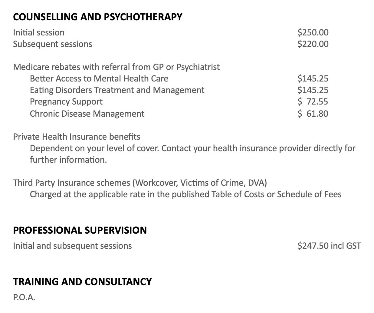 I aim to keep my services accessible to the general community. My fees are significantly lower than the APS National Schedule of Recommended Fees.